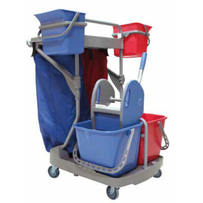 STARACE 108 Reinigungswagen 2 PP- Eimer 6 l blau und rot, 2 Eimer 15 l, blau und rot, 1 Mopppresse auf Metall-Stativ, 1 PP- Halterahmen für Abfallsäcke 120 l, 1 PP- Stielhalter, 1 PP- Moppablage seitlich